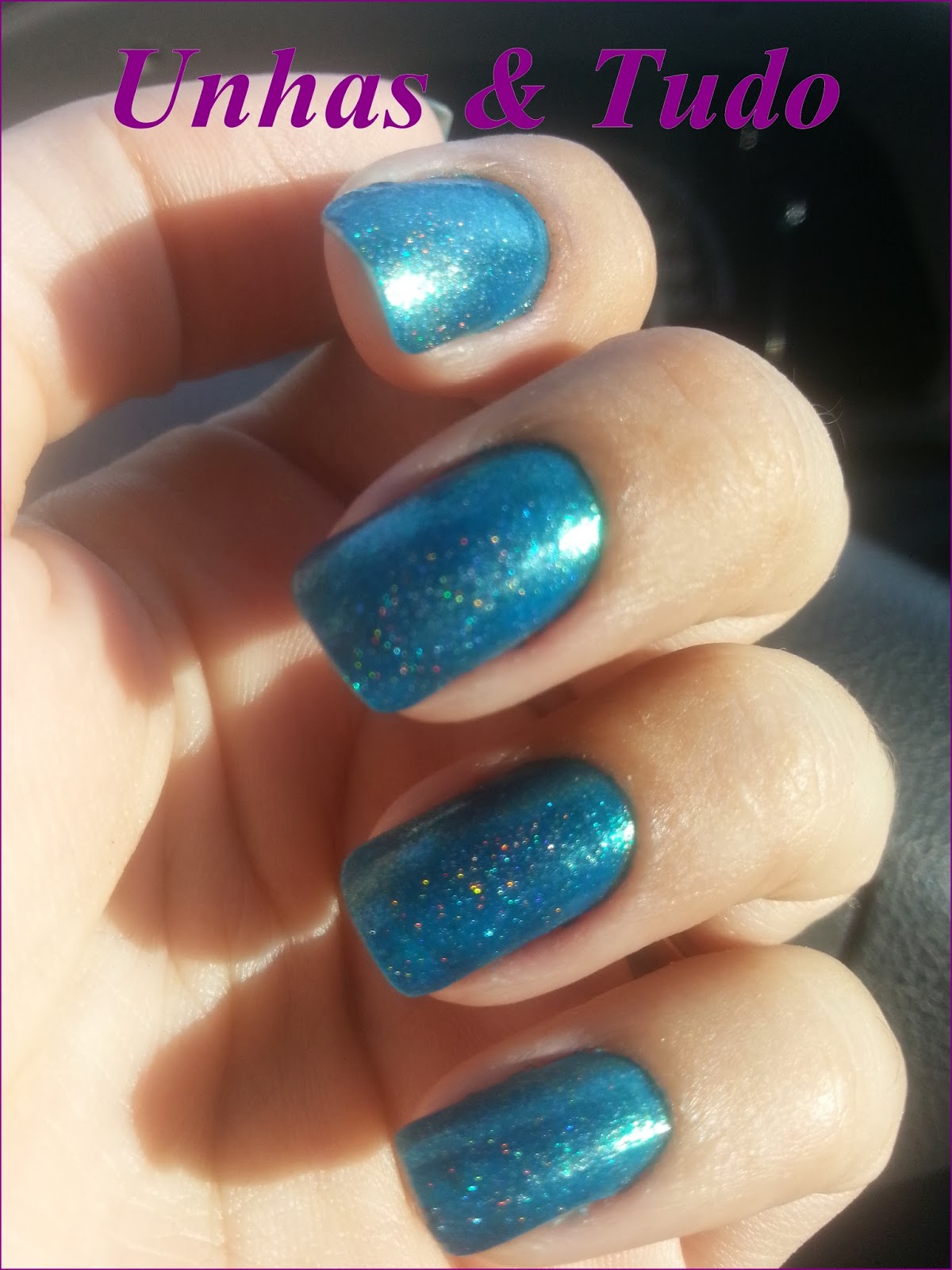 No sol, aquele brilho pra lá de especial. Mesmo assim, dá pra ver as unhas. Me decepcionei. Ainda sim, estou com ele nas unhas. Eu adoro esse tom de azul-verde-holo hahahaha.