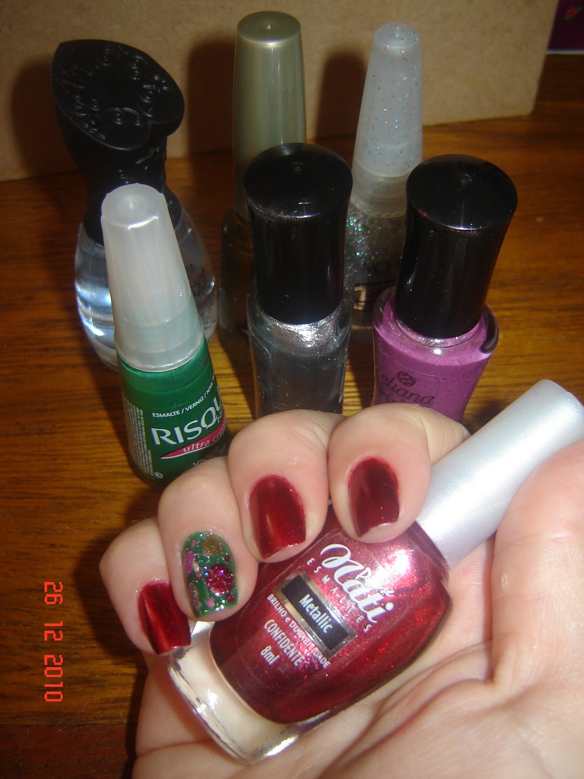 Usei o Confidente da coleção Metallic da Passe Nati. E no anelar, tentei fazer como se fosse a árvore de Natal com as bolinhas coloridas….