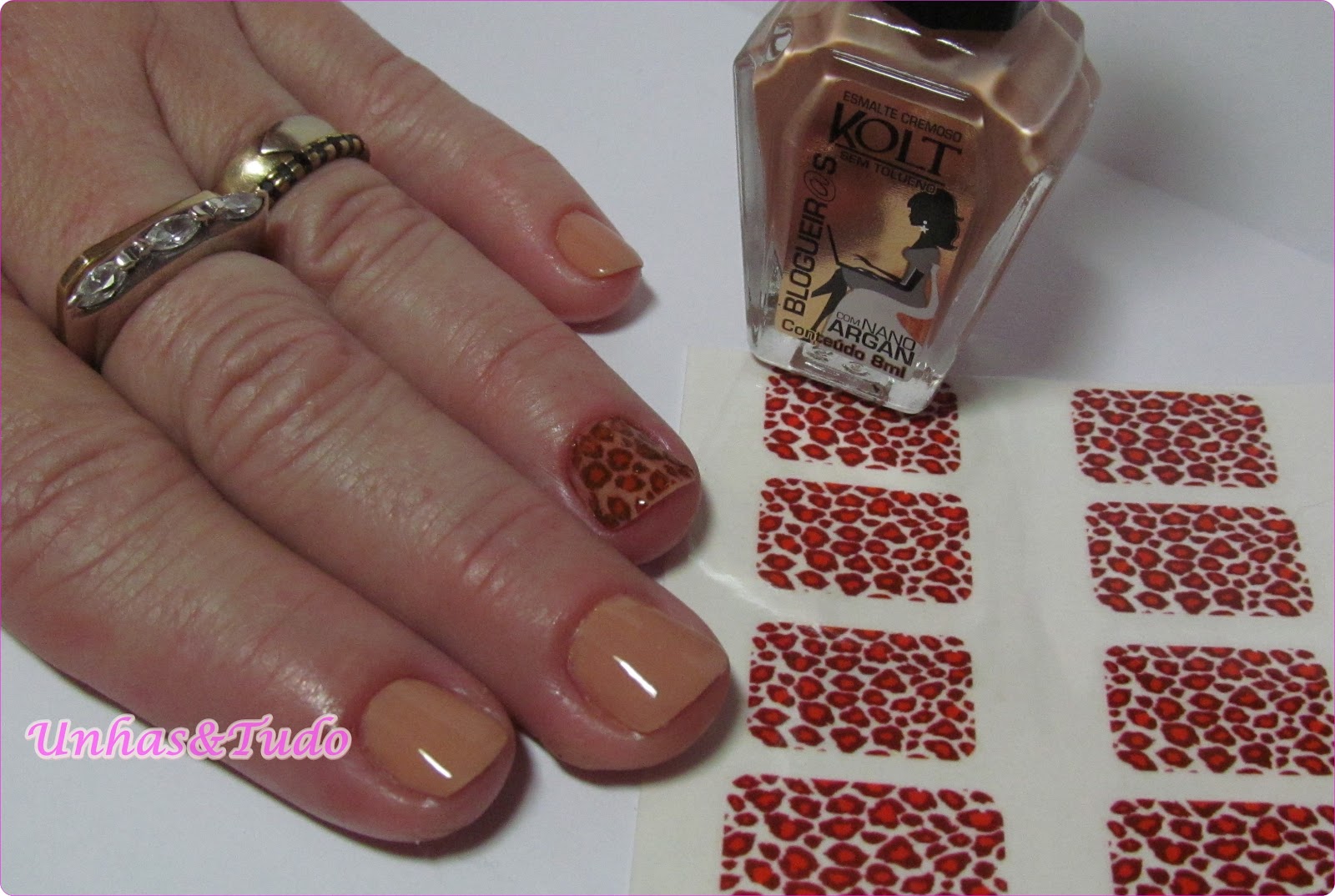 Olha só a minha mamis ousando!!! Resolveu colocar um adesivinho de oncinha, vê se pode isso!!! Usamos o Misterioso da coleção blogueiras da Kolt e no anelar um adesivinho da mesma marca, inclusive nela deu certo, em mim não havia dado muito (aqui).